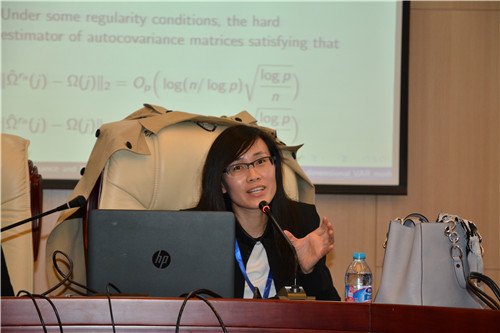开幕式后的大会主旨报告阶段由公司王立勇教授主持。太阳成集团tyc的三位手拉手特聘教授,美国乔治华盛顿大学的梁华教授、美国威斯康星大学的张正军教授、美国佐治亚大学的钟文瑄教授分别作了主旨报告:A Hybrid of Single Index Models and Additive Models,Autoregressive Tail-index Model for Financial Time Series,Leverage sampling to overcome the computational challenges for big spatial data。