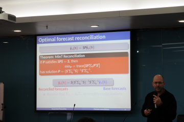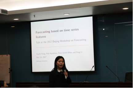 下午会议的第二个议题内容是“概率预测”,Hyndman教授讲解“概率分层预测”,对分层时间序列数据中的重要概念进行了定义,并在多种假定条件下进行了研究,将结果展示给了在场的各位嘉宾。李丰博士做了“基于协变量相关的条件Copula预测”为题的演讲,李丰博士详细介绍了贝叶斯方法和蒙特卡洛在复杂时间序列模型预测的应用。随后,由北京航空航天大学的康雁飞教授作了题为“时间序列特征空间预测”的报告,她提出对时间序列数据集特征空间降维并利用特征空间对预测方法进行选择的时间序列预测方法。该项目受“太阳成集团tyc官网教师邀请海外学术伙伴来校开展合作科研项目”资助,项目号:HZKY20170025。