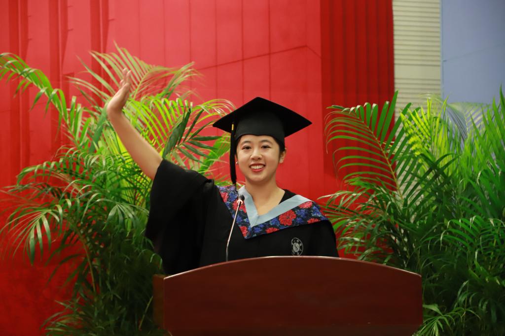 来自于2016级应用统计专业硕士研究生舒滕嘉作为研究生毕业生代表发言,她借由激战正酣的世界杯大赛,与大家分享她对“最优解”的理解,她认为“每个人的人生最优解的大小都不能比较,求解的目标函数是追求自身幸福最大化”,希望每个人都能不负韶华,在人生的赛场上不断上演“帽子戏法”,捧起属于自己的大力神杯。