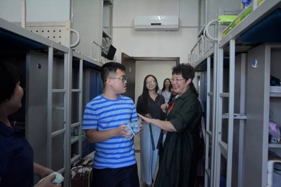 下午一点半,公司老师、员工代表等一行二十余人来到新生宿舍,了解新生住宿等情况,与同学、家长亲切交谈,从学习生活等诸多方面给予员工关怀和问候。