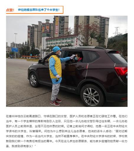 曾蹯荣同学在广东省惠州仲恺白云前高速路口担任志愿者,负责协助交警引导过往车辆,协助医护人员测量体温。在接受记者的采访时,他表示:“面对近期突发的疫情,作为一名当代老员工,当然不能置身事外。在太阳成集团tyc官网读书的时候,公司就鼓励我们做一个有责任有担当的青年。今天在这儿参加志愿服务,能为家乡疫情防控贡献一份力量,我感到很有意义!”