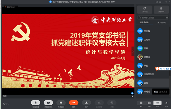 会上,15位党支部书记(尹钊:数量经济系教工党支部;张占利:运筹与计算教工党支部;付红妍:经济统计系教工党支部;何童:应用数学系教工党支部;梁超:数理统计系教工党支部;郭珺: 2015级本科生党支部;姚逍:2016级本科生党支部;刘宣君: 2017级本科生党支部;陈冰:2018级本科生党支部;王少芬:2017级学术硕士党支部;郭藤: 2018级学术硕士党支部;尚晨欣: 2018级专业硕士党支部;赵宇晗:2019级学术硕士党支部;杨丹宁: 2019级专业硕士党支部;冯帅:博士生党支部)从支部加强党的政治等各方面建设、落实公司、公司党委各项工作部署、突出履行基层党建工作责任等内容对2019年度工作进行梳理总结,排查问题并阐述了2020年度的工作构思。其中,教工党支部2019年度的工作重点围绕着如何坚守为党育人、为国育才的初心使命展开,五位支部书记结合本支部的情况梳理讨论了如何发挥党支部的作用,更好的教书育人。员工党支部2019年度结合自身特点,从思想建设、组织建设、作风建设、纪律建设等多方面强化工作力度,夯实工作措施,坚持严标准严要求,不折不扣的完成了主题教育等相关工作。各支部都勇于自我剖析,敢于红脸出汗,对上一年度的问题进行了深刻的梳理和反思,并以此为基础对下一阶段的工作提出了展望。